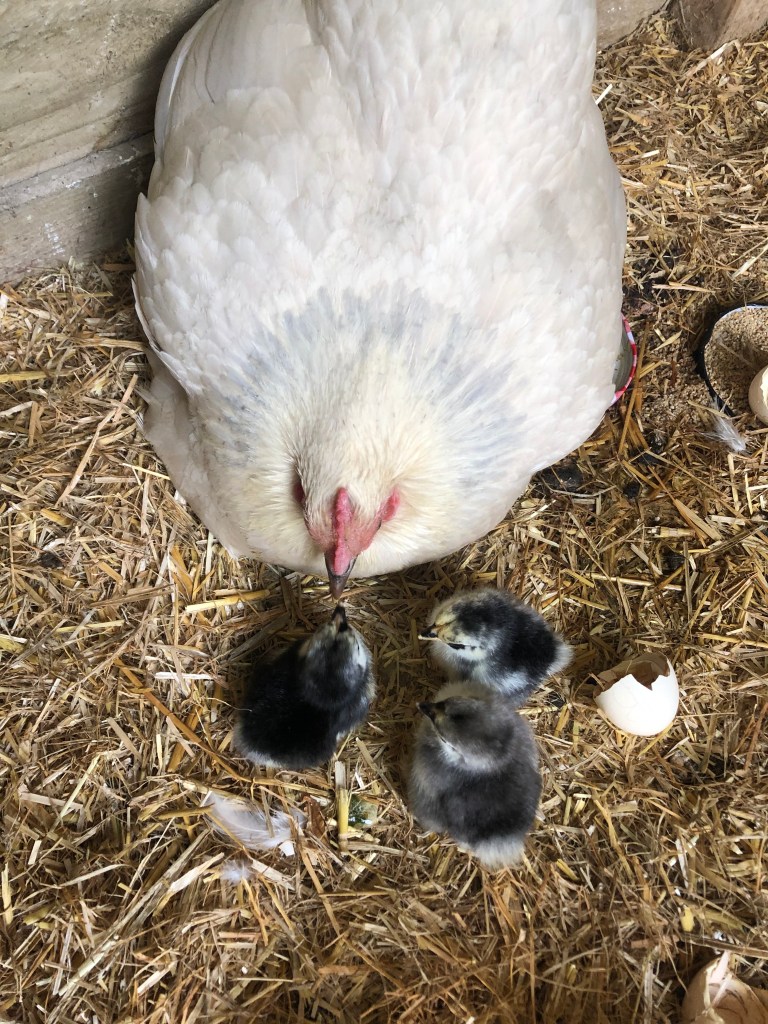 She lost one chick but the remaining three eggs hatched out into these beautiful little fluff balls (Pekin bantams). Clarissa was a fierce mother for the first couple of days and clucked and chattered incessantly to her little brood and puffed herself up like a turkey cock when one of the dogs strayed too near her pen but she’s relaxed again now and it’s lovely to see her so happy with her new family.