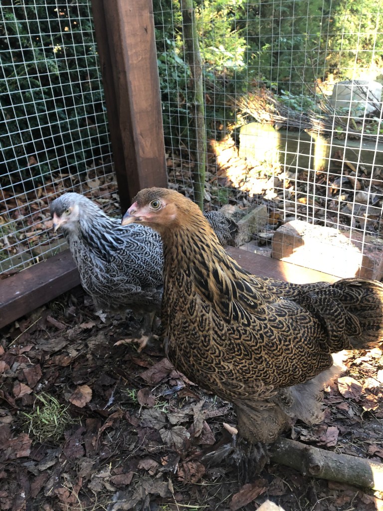 They get through a lot more food than the Pekins, in fact, they probably eat twice as much as the other six put together and they drink litres of water too. We have got a larger drinker for them but I think we may try making one from a white, food-grade bucket and some plastic nipples and cups designed for chickens. They seem nice natured birds and we were looking forward to letting them out to free range once they were old enough but avian flu has put paid to that for now. Their coop is big enough to keep them happy but I think they will be even happier once the threat passes and they can explore the garden with the Pekins. Speaking of the Pekins, we did have two cockerels and one hen as we thought. They have been named Chanticleer, Mouse and Freya and they are in with Bunty, Mavis and Clarissa now, all housed in Hannah’s poly tunnel over winter or until DEFRA advise that they can be let out again.