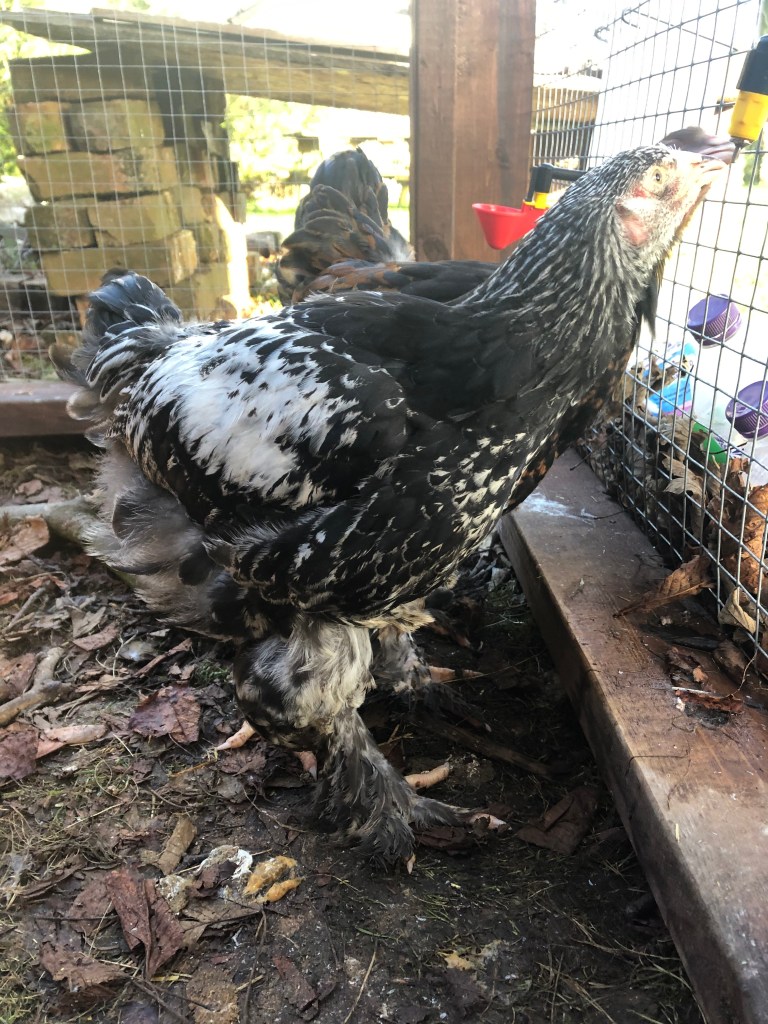 As always we wanted hens but got mostly cock birds. We think that three out of the five are male but, providing they don’t fight, we’ll keep them all unless anyone wants one or is willing to exchange for an unrelated bird. They are now outside in a lovely large coop made by Hannah’s husband, George. It has taken them a while to figure out how to get up their ramp which is, admittedly, a very long climb from the floor because they haven’t got a mother hen to show them the ropes. Hannah patiently lifted them up the ramp one by one for a few weeks until they got the hang of it.